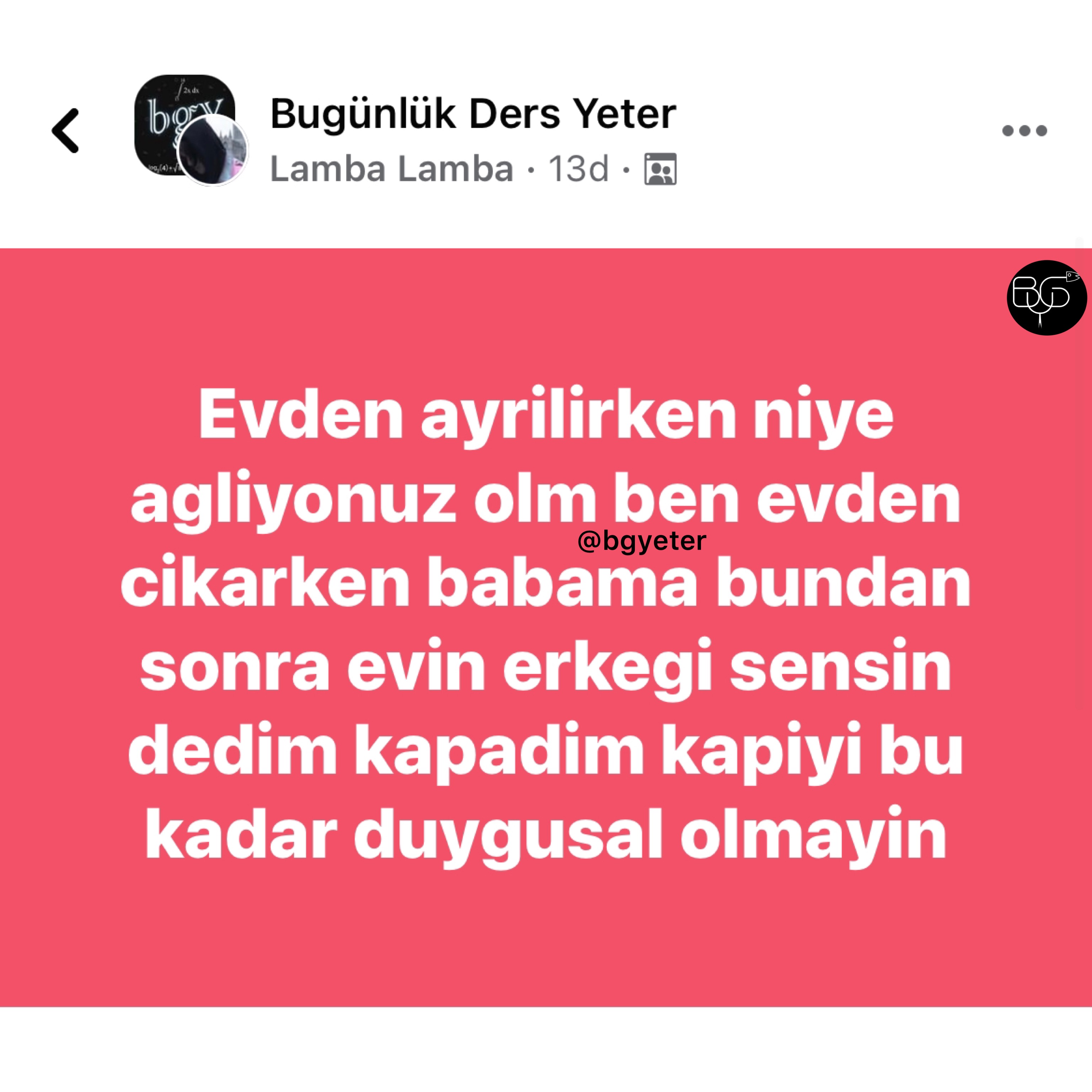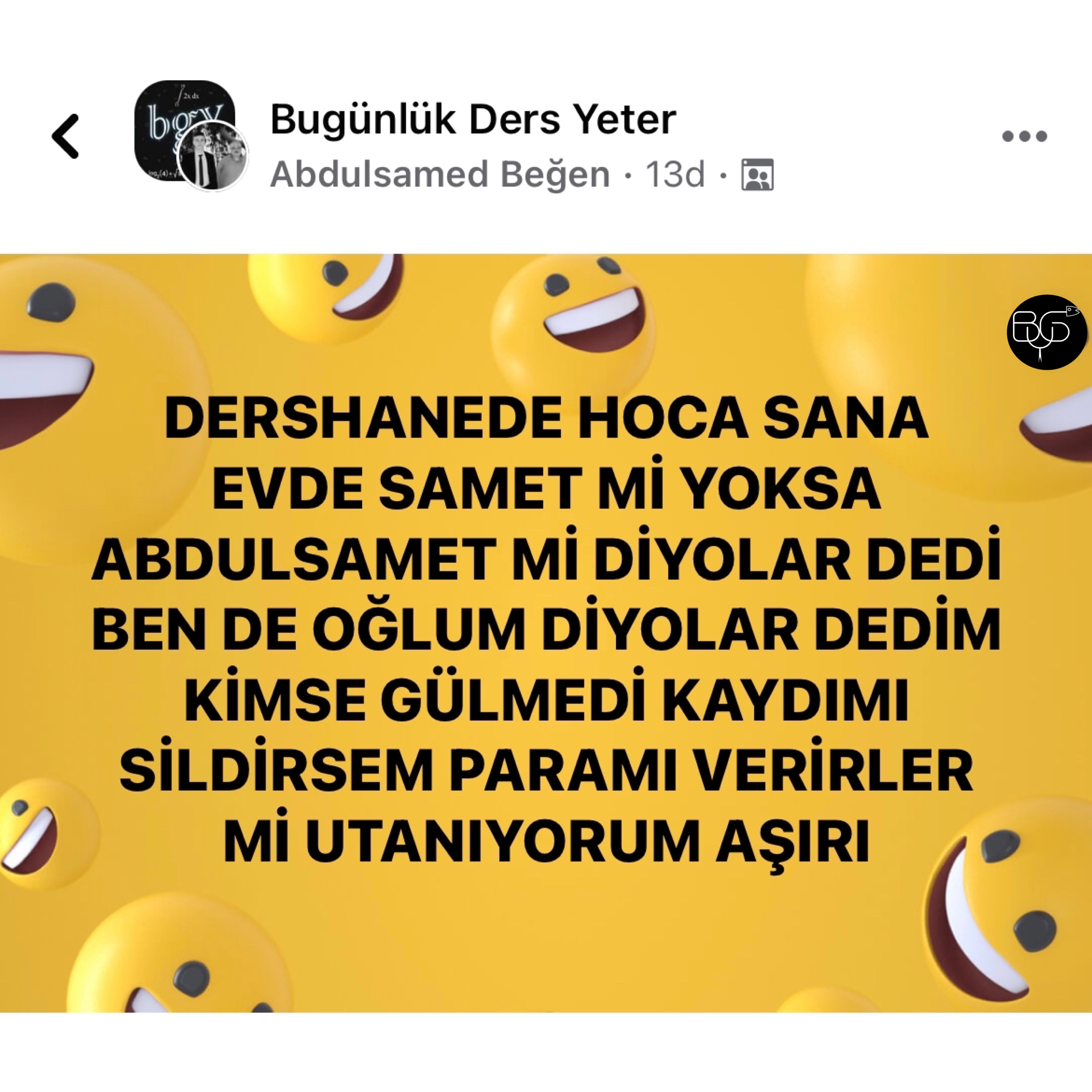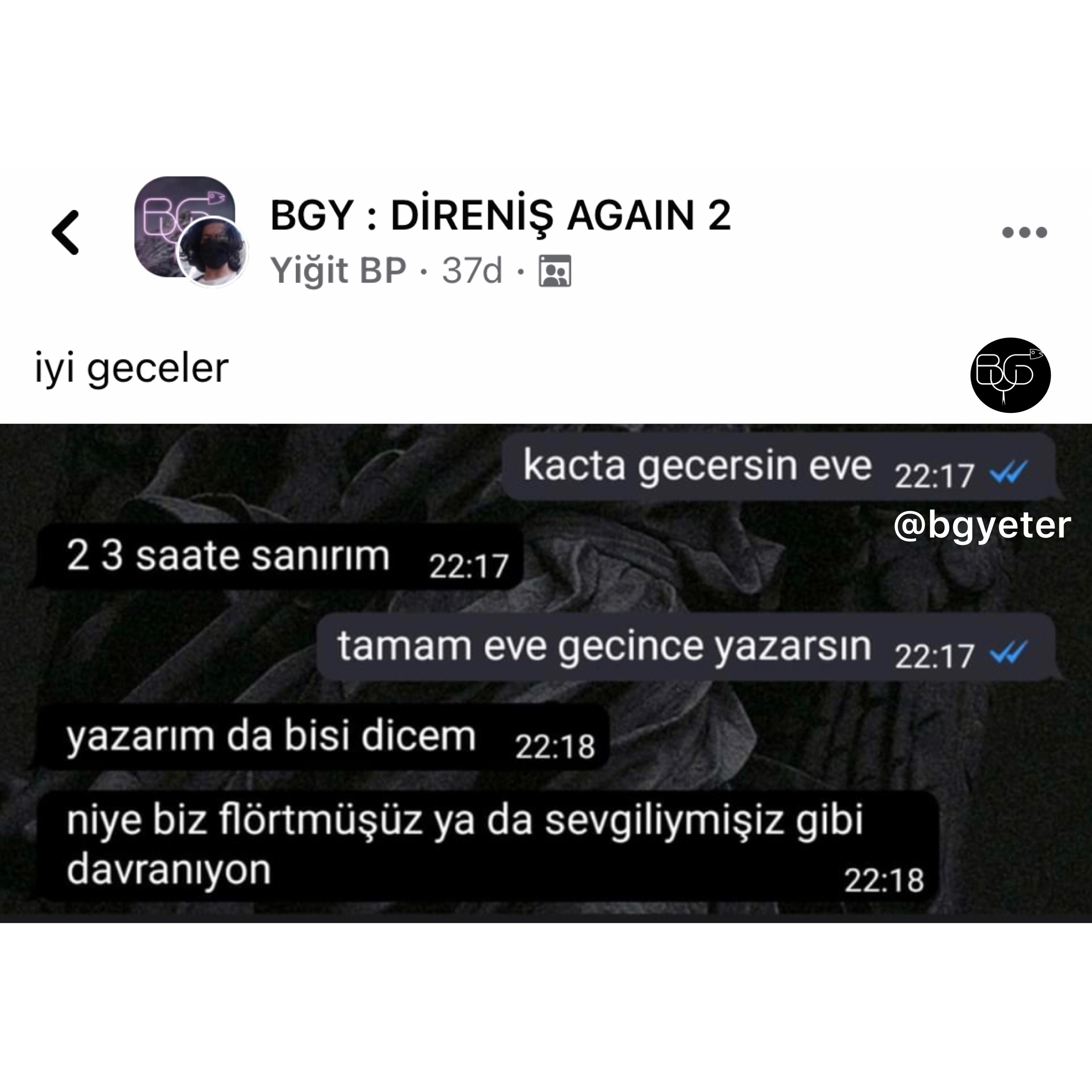 BGY, Facebook'ta Bugünlük Bu Kadar Grup Yeter adıyla faaliyet gösteren ve yönetimini Ömer Serdar Özkan ile Mert Güngördü'nün üstlenmiş olduğu bir topluluktur. Amacı tamamiyle '' mizah '' olan bu topluluk zamanla güçlenmiş ve 16-25 yaş aralığının en aktif katılım gösterdiği sosyal grup haline gelmiştir.