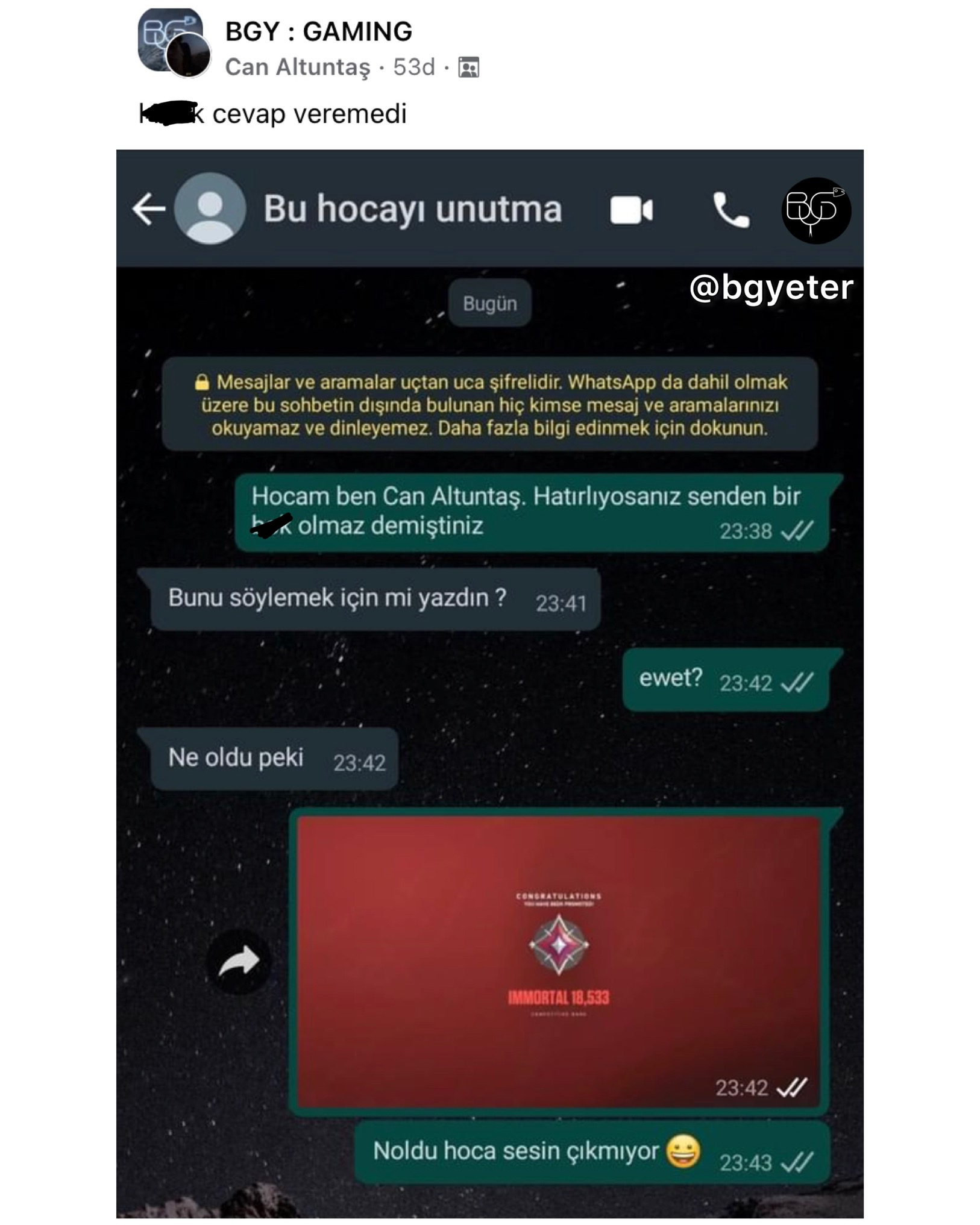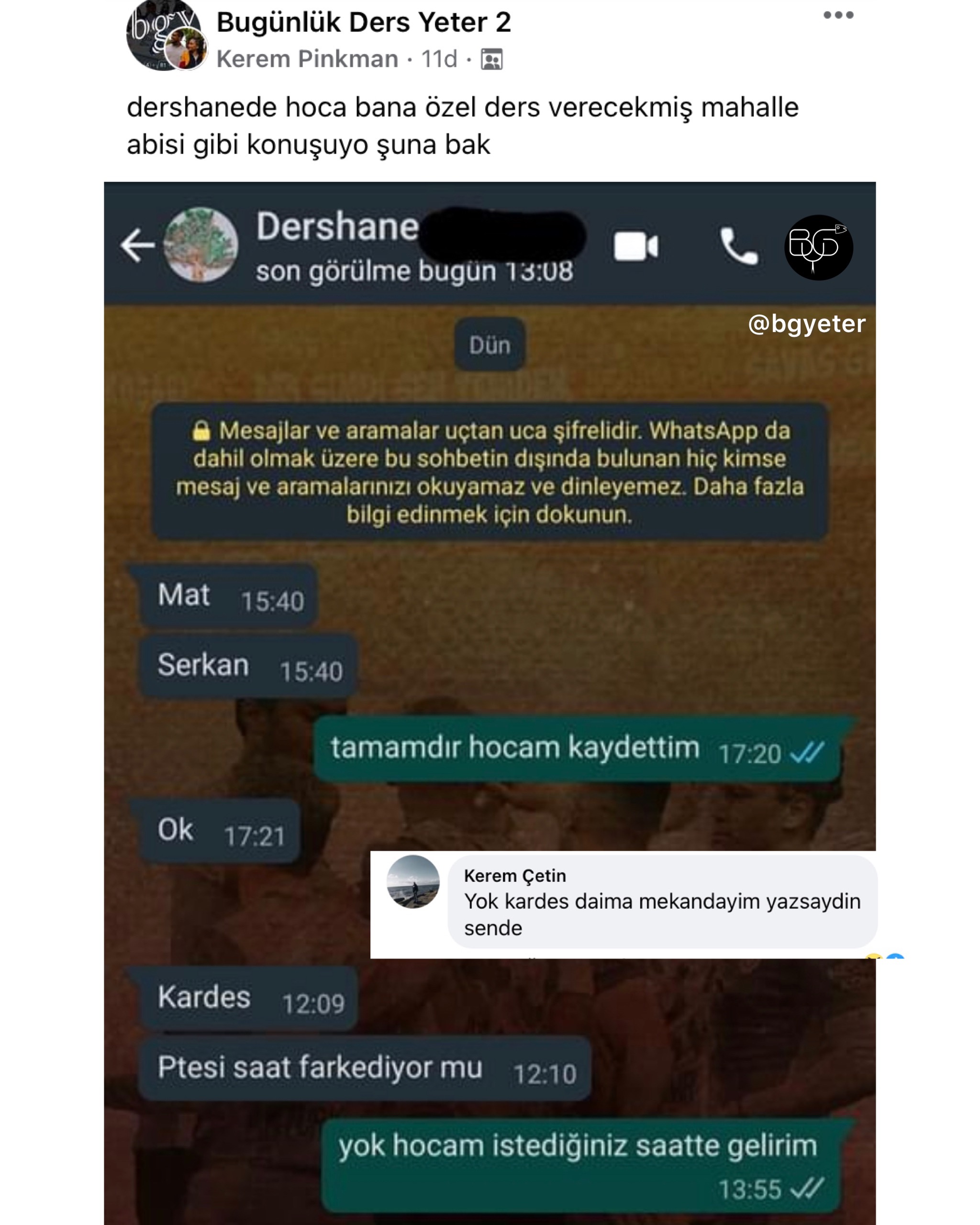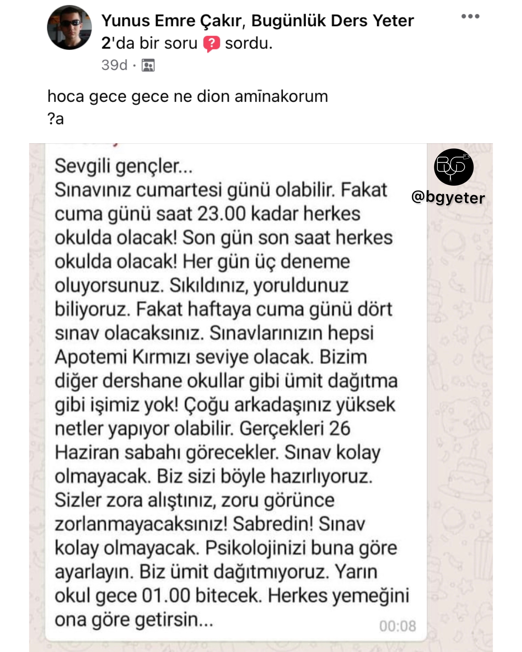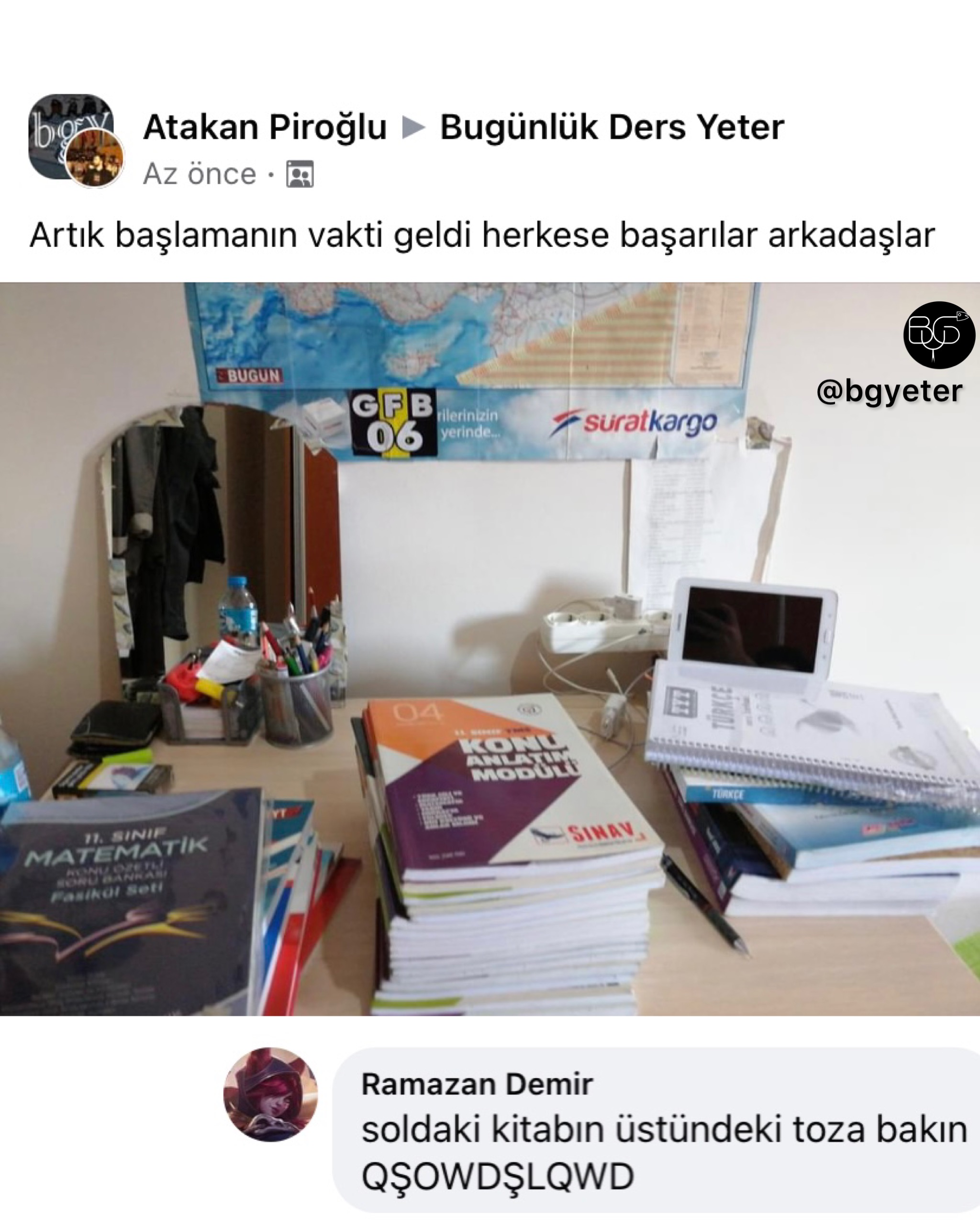 BGY, Facebook'ta Bugünlük Bu Kadar Grup Yeter adıyla faaliyet gösteren ve yönetimini Ömer Serdar Özkan ile Mert Güngördü'nün üstlenmiş olduğu bir topluluktur. Amacı tamamiyle '' mizah '' olan bu topluluk zamanla güçlenmiş ve 16-25 yaş aralığının en aktif katılım gösterdiği sosyal grup haline gelmiştir.