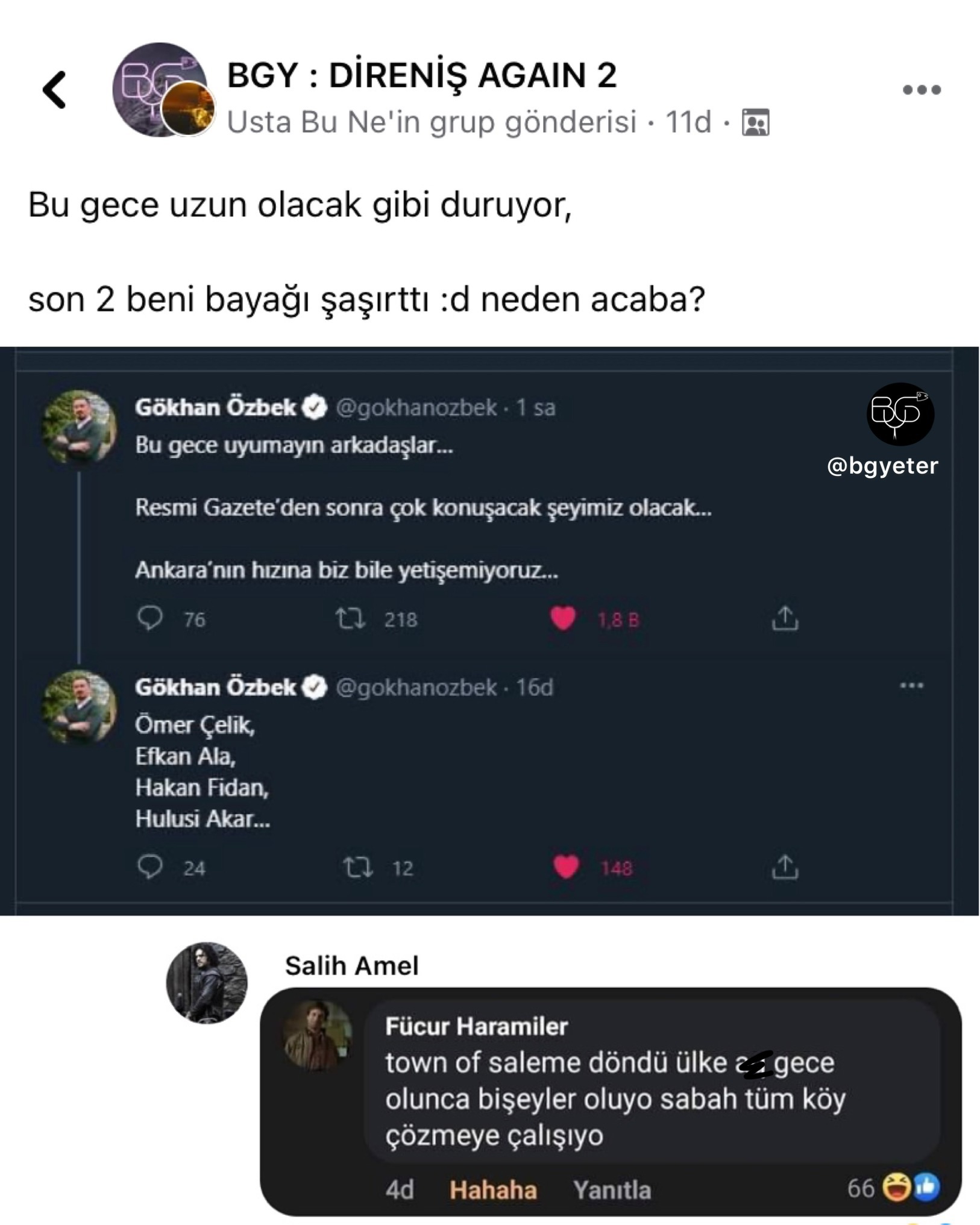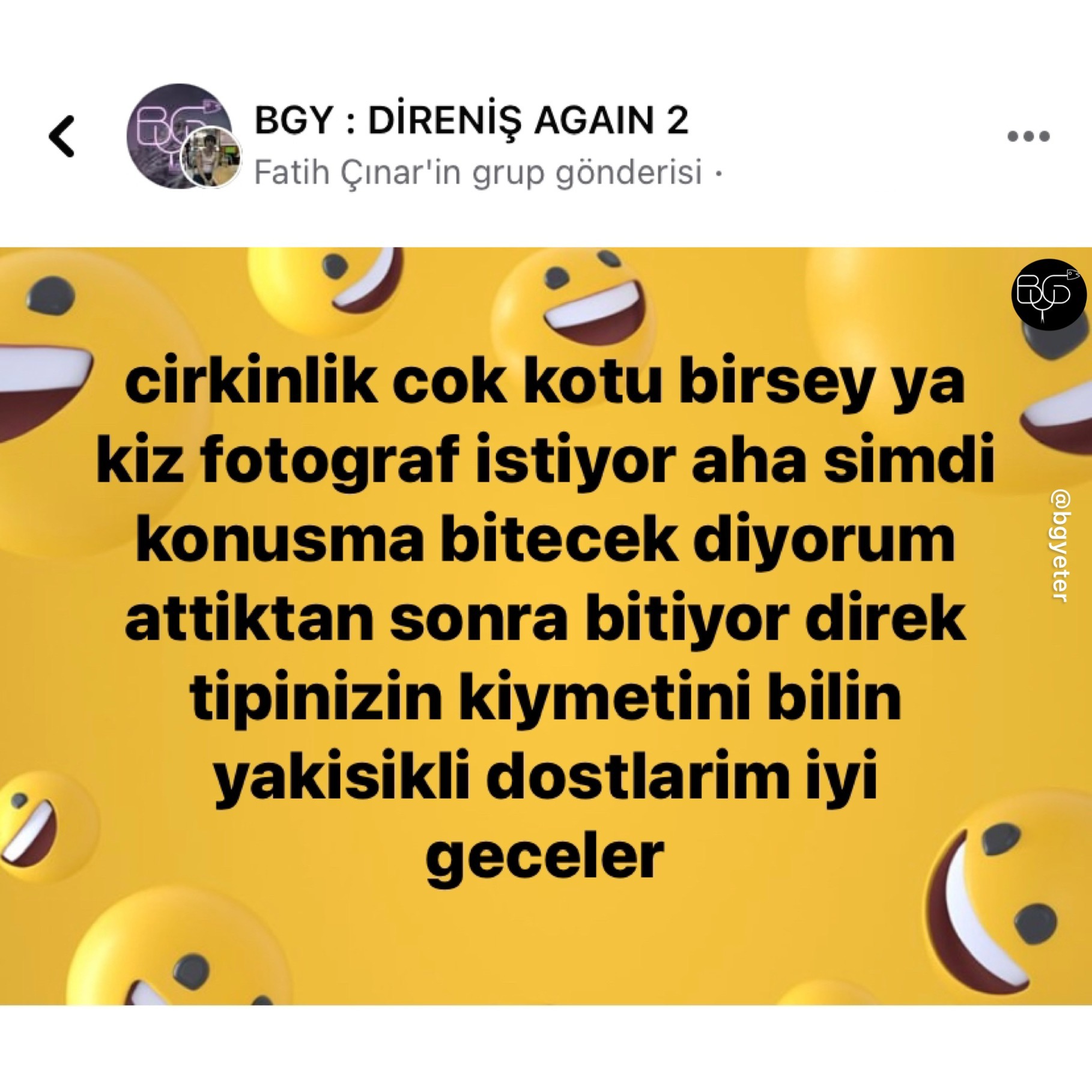 An itibariyle toplam 350 bin kişiyi geçen üye sayısı, sahip olduğu tüm hesaplar düşünüldüğünde 5 milyonu bulan takipçisi ve 6 aktif grubu vardır. Facebook üzerinde zamanla ihtiyaçtan doğan bu grupları şöyle sıralamak mümkündür: BGY: Direniş Again, BGY: Sports , Bugünlük Ders Yeter , BGY: Gaming , BGY: Stonks ve BGY: Karma. BGY ve aslında BGY’li olmak yani bir aidiyet hissetmek bu topluluğun gücü açısından oldukça önemlidir. Çünkü BGY’liler mizah ile her türlü takdir ve eleştiriyi yansıtabilirler; herhangi bir konudaki kızgınlık, üzgünlük ya da mutluluk gibi duygularını mizah aracılığıyla gösterebilirler. Kısacacı gücünü toplam sayısı ve kitlesindeki aktiflikten alan grup, Z kuşağının gerçekçi bir örneğidir.