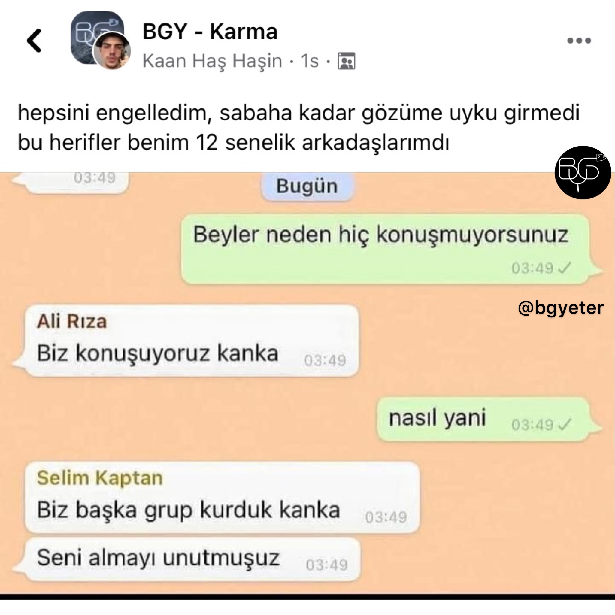 BGY, Facebook'ta Bugünlük Bu Kadar Grup Yeter adıyla faaliyet gösteren ve yönetimini Ömer Serdar Özkan ile Mert Güngördü'nün üstlenmiş olduğu bir topluluktur. Amacı tamamiyle '' mizah '' olan bu topluluk zamanla güçlenmiş ve 16-25 yaş aralığının en aktif katılım gösterdiği sosyal grup haline gelmiştir.